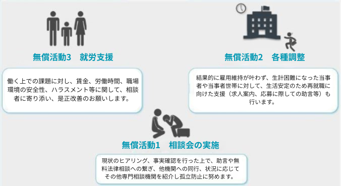 働く上での課題に対し、賃金、労働時間、職場環境の安全性、ハラスメント等に関して、相談者に寄り添い、是正改善のおいをします。